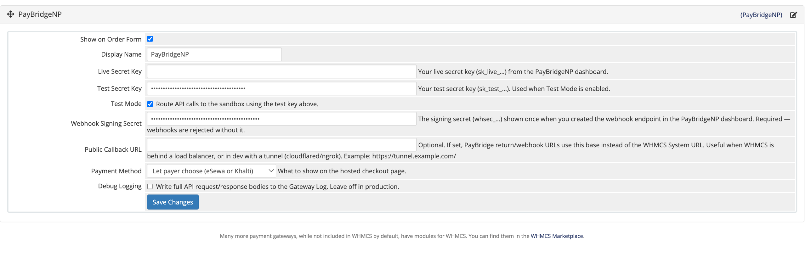 Invoice not marking as paid after payment: Check that your webhook URL is correctly registered and that the PayBridgeNP module has cURL access to the PayBridgeNP API. Also check the WHMCS Gateway Log for any errors.