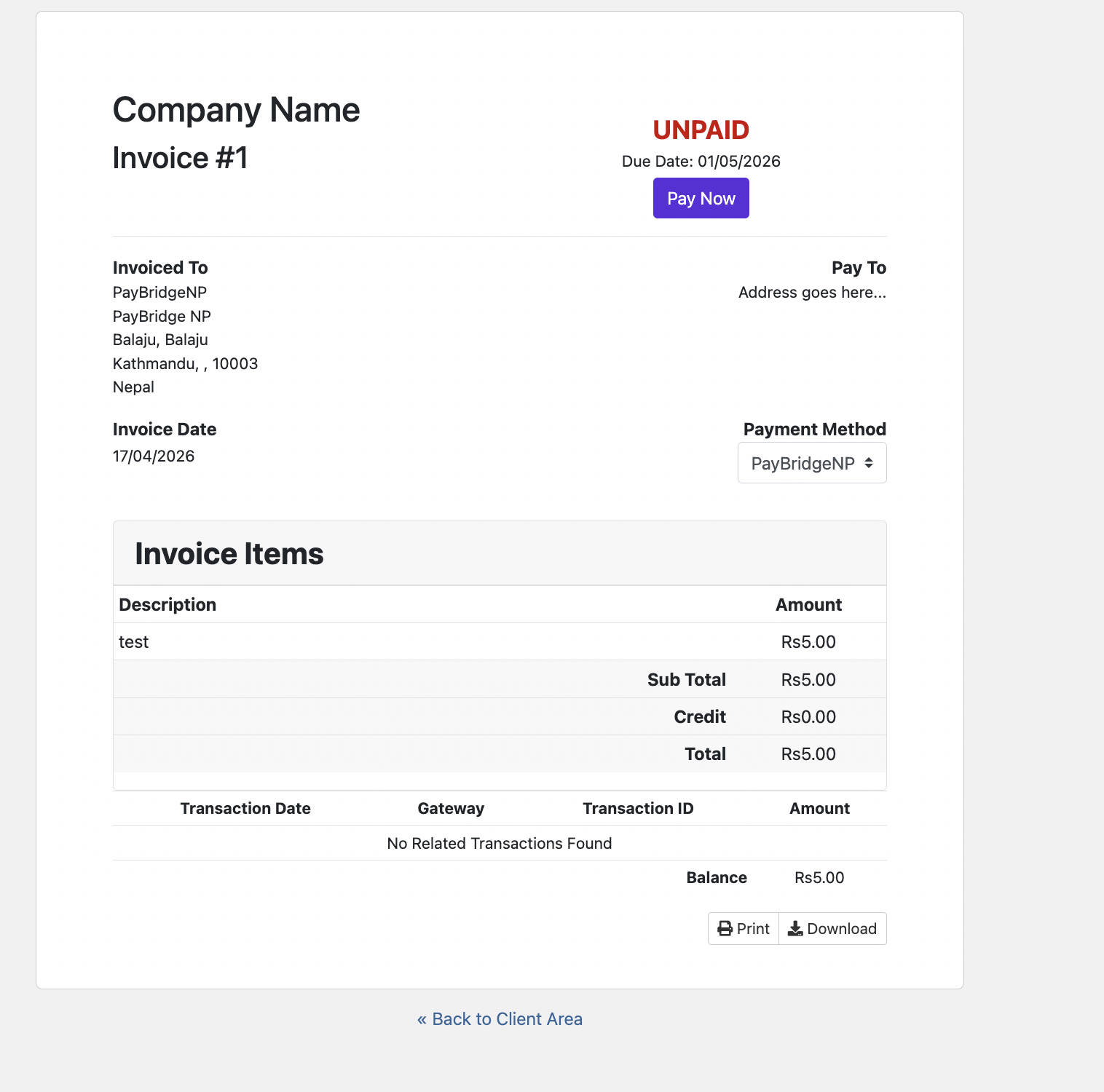 For hosting services with monthly/annual renewals, WHMCS generates invoices automatically. Clients can pay each renewal invoice via PayBridgeNP. There's no auto-charge (Nepali payment providers don't support card-on-file style recurring billing currently) - clients pay each invoice manually when due.